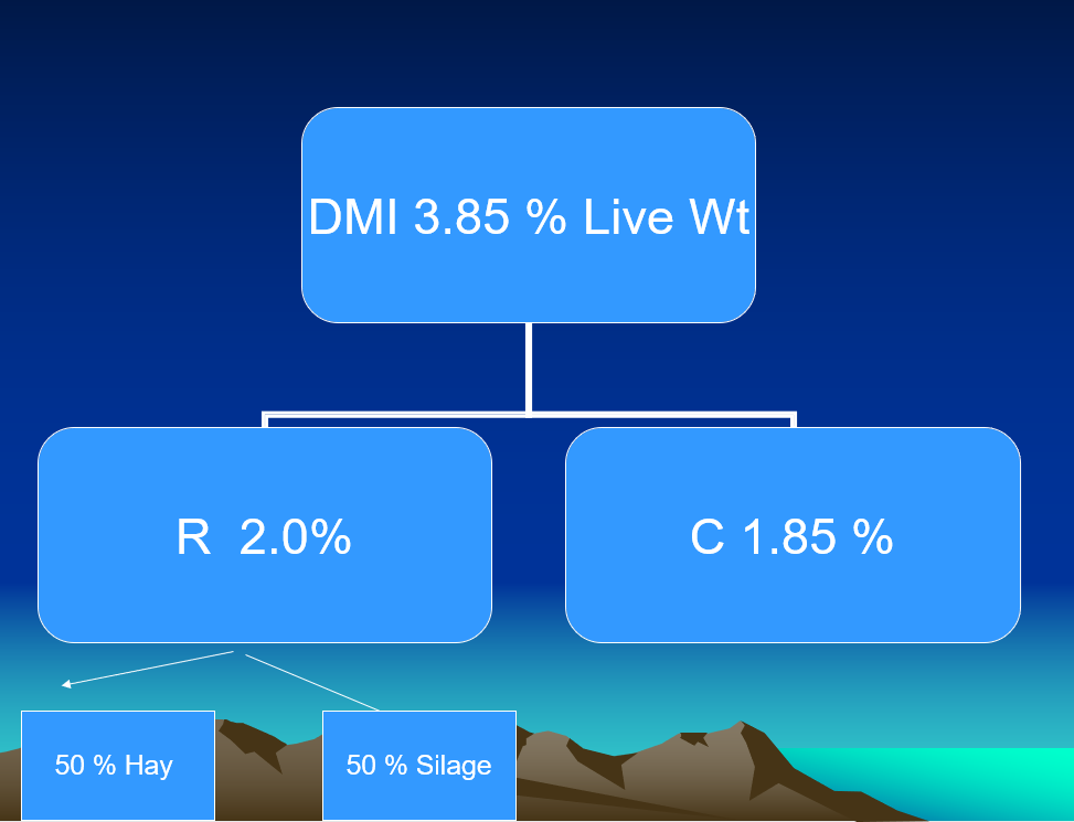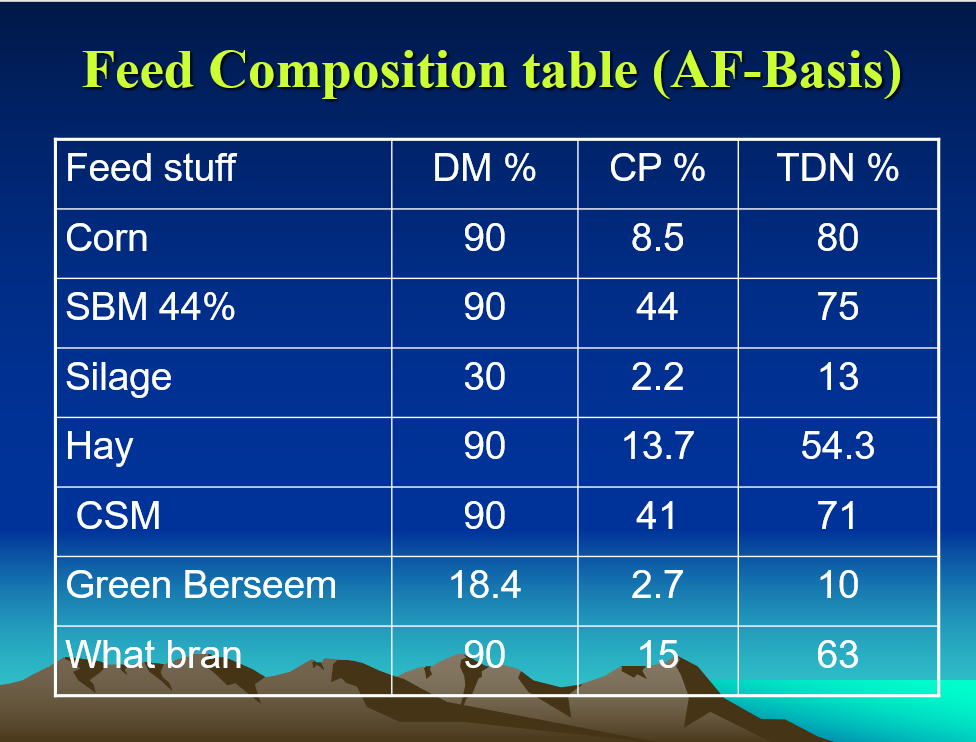 Powerpoint on food rations for dairy cows attached to data analysis tables, arithmetic equations and laws used to calculate the quantities and components of dairy cow feed